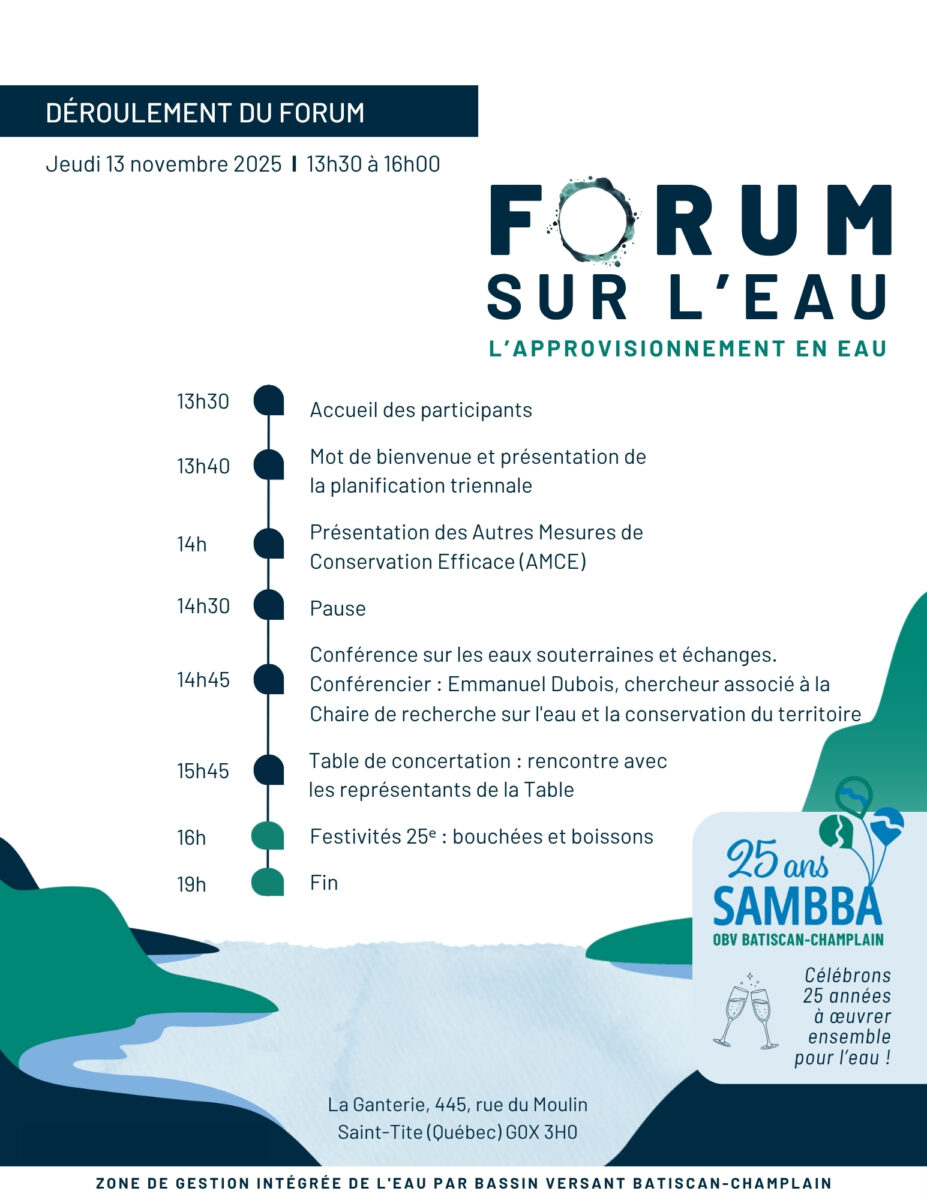 Il nous fait grand plaisir de vous convier à notre 3e Forum sur l’eau qui a pour thème l'une des problématiques priorisées du Plan directeur de l'eau (PDE) 2024-2034 de la zone Batiscan-Champlain : l'approvisionnement en eau. Ce sera un moment de partage de connaissances et de discussion ouverte.
