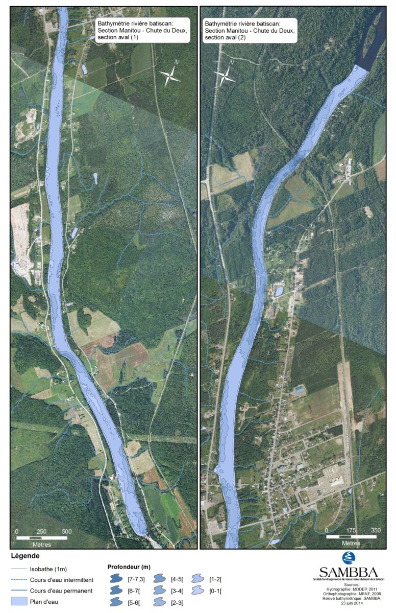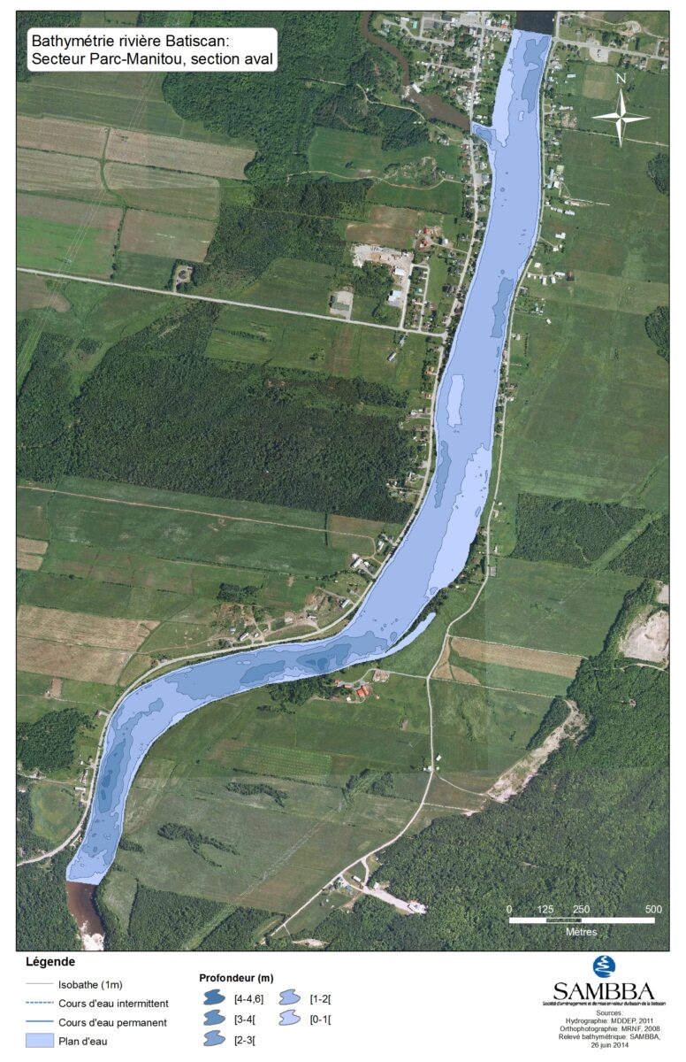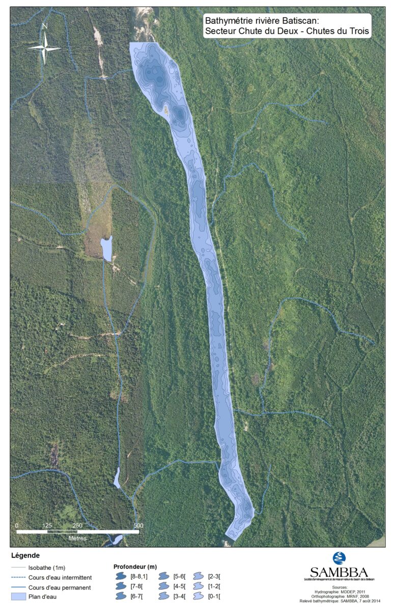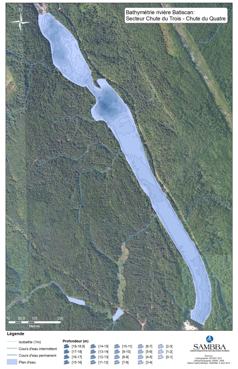 En 2014, la SAMBBA a effectué la bathymétrie d’une section de la rivière Batiscan qui s'étendait de la chute du Sept dans la municipalité de Lac-aux-Sables jusqu'au barrage à Saint-Narcisse. Seule la portion entre les chutes du Cinq et du Six situé à Lac-aux-Sables n'a pas été analysée, car elle est difficilement accessible en embarcation.