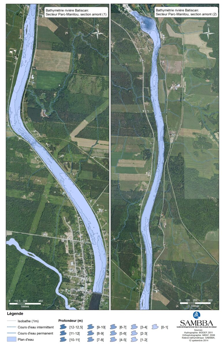 La méthodologie utilisée pour effectuer la bathymétrie des différents secteurs de la rivière Batiscan fût basée sur le Guide de normalisation des inventaires bathymétriques du ministère des Ressources naturelles et de la Faune. Après avoir parcouru la rivière et enregistré les données de profondeurs, l’équipe a produit une carte bathymétrique pour chacun des huit secteurs: