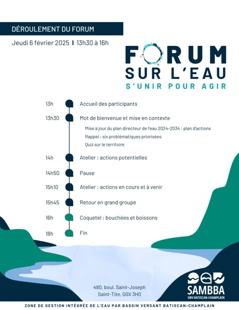Il nous fait grand plaisir de vous convier à notre 2e forum sur l’eau qui a pour thème « S’unir pour agir ». Après s’être fixé des objectifs pour améliorer les 6 grandes problématiques liées à l’eau dans la zone Batiscan-Champlain, ce sera l’occasion de se rassembler pour partager les actions que vous réalisez ou allez réaliser pour protéger l’eau.
