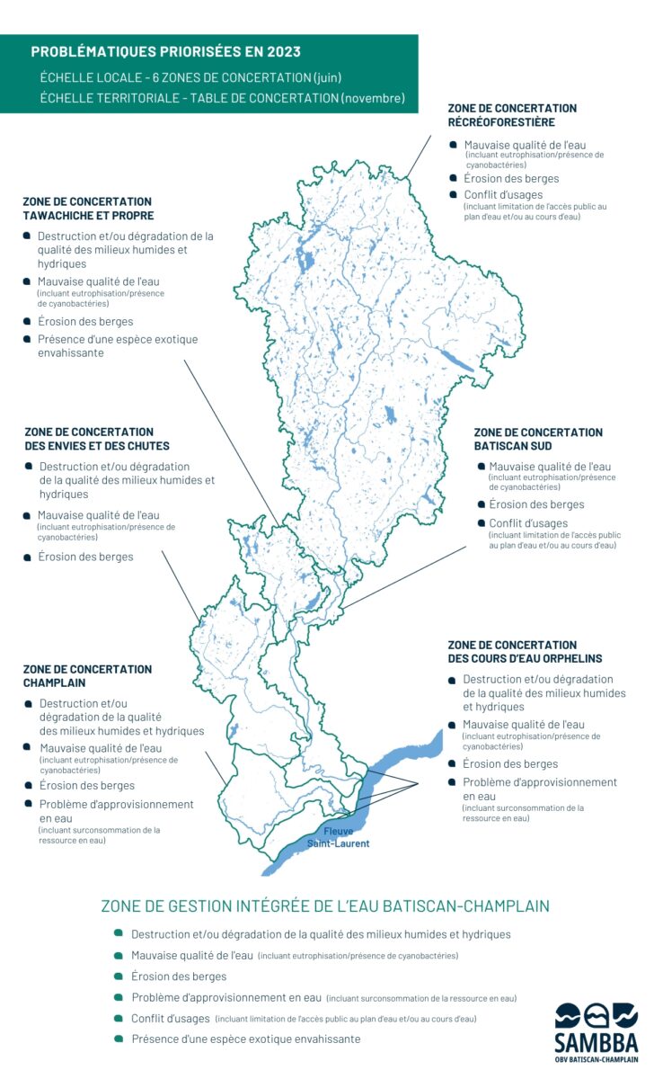 Le Plan directeur de l'eau de la zone Batiscan-Champlain est composé des 6 problématiques priorisées par les utilisateurs de l'eau en 2023 à l'échelle des zones de concertations, ainsi qu'à l'échelle territoriale de la table de concertation.